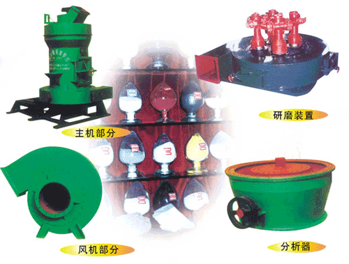 |  |    | R型雷蒙磨粉機(jī)主要部件: |   |  |   | 3R1410、2115、2615、4R2714強(qiáng)力2714及3016、3216型懸輥式雷蒙磨是適應(yīng)中小型礦山、化工、建材、冶金、耐火材料、制藥、水泥等行業(yè)的高效閉路循環(huán)的高細(xì)制粉設(shè)備,是代替球磨機(jī)加工粉末的一種新型磨粉機(jī),產(chǎn)量能耗均達(dá)到國家標(biāo)準(zhǔn),居國內(nèi)先進(jìn)水平,備受各行業(yè)用戶的好評。 該產(chǎn)品機(jī)采用國外同類產(chǎn)品的先進(jìn)結(jié)構(gòu),并在大型雷蒙磨的基礎(chǔ)上更新改進(jìn)設(shè)計(jì)而成。該設(shè)備比球磨機(jī)效率高,電耗低,占地面積小,一次性投資小。磨輥在離心力的作用緊緊地碾壓在磨環(huán)上,因此當(dāng)磨輥、磨環(huán)磨損到一定厚度時(shí)不影響成品的產(chǎn)量與細(xì)度。磨輥、磨環(huán)更換周期長,從而剔除了離心粉碎機(jī)易損件更換周期短的弊病。該機(jī)的風(fēng)選氣流是在風(fēng)機(jī)--磨殼--旋風(fēng)分離器--風(fēng)機(jī)內(nèi)循環(huán)流動(dòng)作業(yè)的,所以比高速離心粉碎機(jī)粉塵少,操作車間清潔、環(huán)境無污染。
